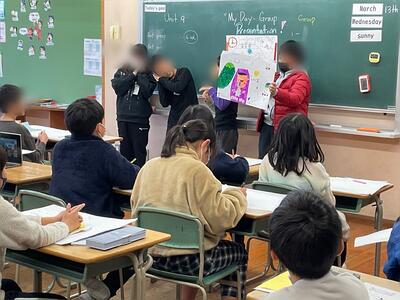 外国語活動『This is my day.』で、ぼく、わたしの1日をグループで発表しました。この1年で、テレサ先生からたくさんの英語を学び、外国語に親しみ、積極的にコミュニケーションを取ろうとする姿がありました。