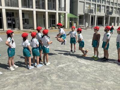 2年生は体育でゴム跳びや、縄跳びをしています。8の字とびの練習を始めたころは、自分で入ることができない子が多かったですが、ぐんぐん成長して、自分で入れるようになったり、前の友達と連続で跳んだりできるようになりました。みんなで「1、2、3・・・」と声を出しながら、連続で何回跳ぶことができるか挑戦し、記録を伸ばして一緒に喜んでいる姿が見られました。