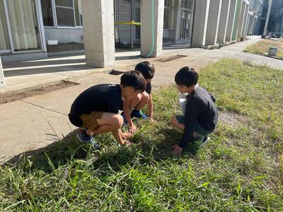 自然豊かで大量のどんぐりが落ちている光景に衝撃を受けて、夢中でどんぐりを拾う1年生の姿が印象的でした。