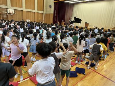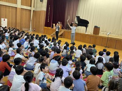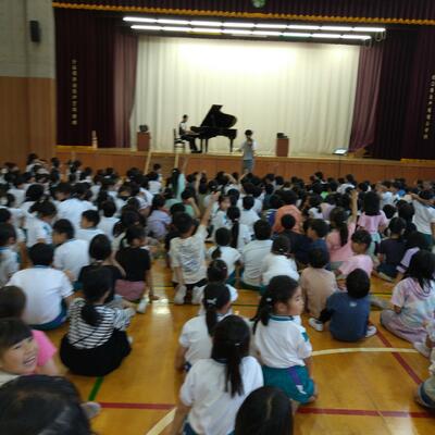エバリーさんによる音楽観賞教室があり、1・2・3年生が参加しました。ピアノとバイオリンと歌に盛り上がりました。