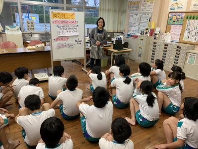 今日は、高学年の発育測定を行いました。発育測定の前に、養護教諭から保健指導を行いました。靴下の種類や役割について学習します。4種類の靴下を例示し、どんな形でどんな役割があるのか考えてもらいました。