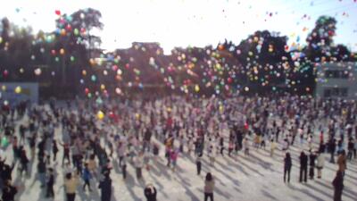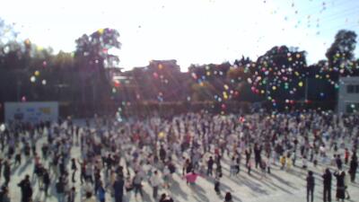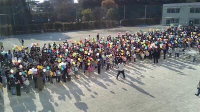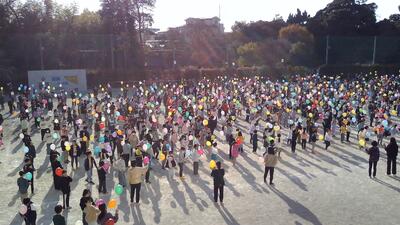 青空のもと、ハッピーバースデーの曲をうたい、風船を飛ばして20周年を祝いました。