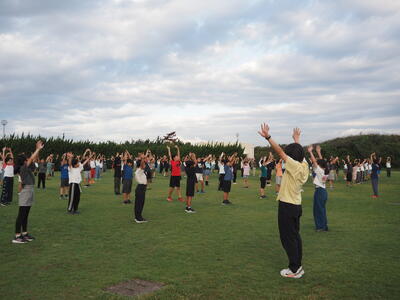 大貫海浜学園2日目。園庭で、朝の気持ち良い空気を感じながら、自校体操をしました。朝食を食べた後は、お世話になった学園の大掃除をし、退園式を終えた後は、海辺散策。貝を拾ったりカニを見つけたりしながら、大貫の海を思う存分満喫しました。